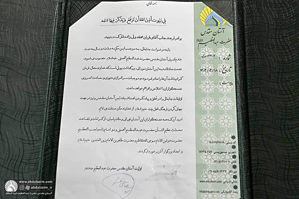 Celebrations of Shaban Month in the Holy Shrine of Hazrat...Iranian new year( NOWRUZ) ceremony in holy shrine - 1396...Celebrating the Anniversary Birth of Imam Mahdi (as) with...Holy shrine's photosHoly shrine of Hazrat Abdul Azim Hasani (PBUH) Statement...Hosting Fast Pilgrims in Blessed Month of Ramadan in the...Top trainees of Holy Shrine's Quran Training Centre were...Ceremony of ITIKF( prayer seclusion) in central mosque...Celebration on the Eid –e-Mab'as", the celebration of... Time schedule of various religious events which will be...