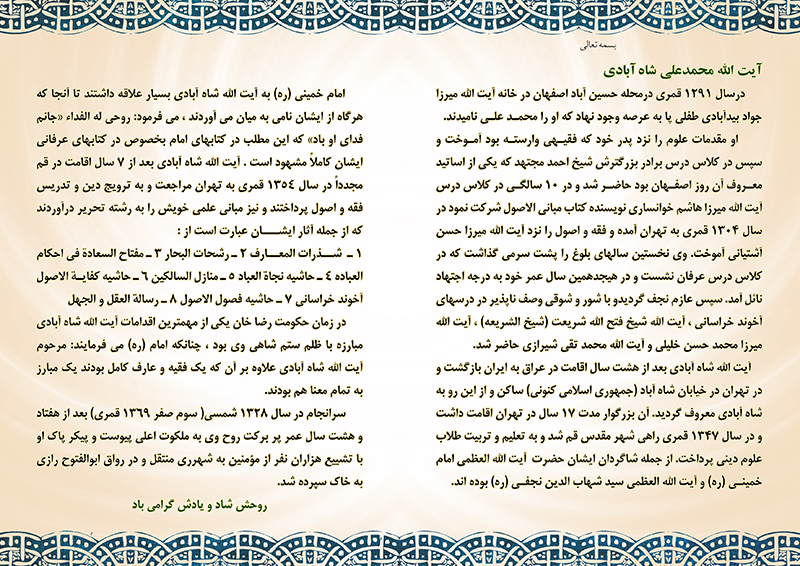 در سال 1291 قمری در محله حسین آباد اصفهان در خانه آیت الله میرزا جواد بیدآبادی طفلی پا به عرصه وجود نهاد كه او را محمد علی نامیدند. او مقدمات علوم را نزد پدر خود که فقیهی وارسته بود آموخت و سپس در كلاس درس برادر بزرگترش شیخ احمد مجتهد كه یكی از اساتید معروف آن روز اصفهان بود حاضر شد و در 10 سالگی در كلاس درس آیت الله میرزا هاشم خوانساری نویسنده كتاب مبانی الاصول شركت نمود در سال 1304 قمری به تهران آمده و فقه و اصول را نزد آیت الله میرزا حسن آشتیانی آموخت. وی نخستین سالهای بلوغ را پشت سرمی گذاشت كه در كلاس درس عرفان نشست و در هجدهمین سال عمر خود به درجه اجتهاد نائل آمد. سپس عازم نجف گردید و با شور و شوقی وصف ناپذیر در درسهای آخوند خراسانی ، آیت الله شیخ فتح الله شریعت (شیخ الشریعه) ، آیت الله میرزا محمد حسن خلیلی و آیت الله محمد تقی شیرازی حاضر شد. آیـــت حــق شــاه آبــادی بعد از هشت سال اقامت در عراق به ایران بازگشت و در تهران در خیابان شاه آباد (جمهوری اسلامی كنونی) ساكن و از این رو به شاه آبادی معروف گردید. آن بزرگوار مدت 17 سال در تهران اقامت داشت و در سال 1347 قمری راهی شهر مقدس قم شد و به تعلیم و تربیت طلاب علوم دینی پرداخت. از جمله شاگردان ایشان حضرت آیت الله العظمی امام خمینی(ره) و آیت الله العظمی سید شهاب الدین نجفی(ره) بوده اند. امــــام خمینی (ره) به آیت الله شاه آبادی بسیار علاقه داشتند تا آنجا كه هرگاه از ایشان نامی به میان می آوردند ، می فرمود: روحی له الفداء «جانم فدای او باد» این مطلب در كتابهای امام بخصوص در كتابهای عرفانی ایشان كاملاً مشهود است . آیت الله شاه آبادی بعد از 7 سال اقامت در قم مجدداً در سال 1354 قمری به تهران مراجعت و به ترویج دین و تدریس فقه و اصول پرداختند و نیز مبانی علمی خویش را به رشته تحریر درآوردند كه از جمله آثار ایشـــان : شــذرات المعــارف 2 ـ رشحات البحار 3 ـ مفتاح السعاده فی احكام العباده 4 ـ حاشیه نجاه العباد 5 ـ منازل السالكین 6 ـ‌ حاشیه كفایـه الاصول آخوند خراسانی 7 ـ حاشیه فصول الاصول 8 ـ رساله العقل و الجهل، می باشد. در زمان حكومت رضا خان یكی از مهمترین اقدامات آیت الله شاه آبادی مبارزه با ظلم و ستم شاهی وی بود . چنانكه امام (ره) می فرمایند: مرحوم آیت الله شاه آبادی علاوه بر آن كه یك فقیه و عارف كامل بودند یك مبارز به تمام معنا هم بودند. سرانجام در سال 1328 شمسی( سوم صفر 1369 قمری) بعد از هفتاد و هشت سال عمر پر بركت روح وی به ملكوت اعلی پیوست و پیكر پاك او با تشییع هزاران نفر از مؤمنین به شهرری منتقل و در رواق ابوالفتوح رازی به خاك سپرده شد.